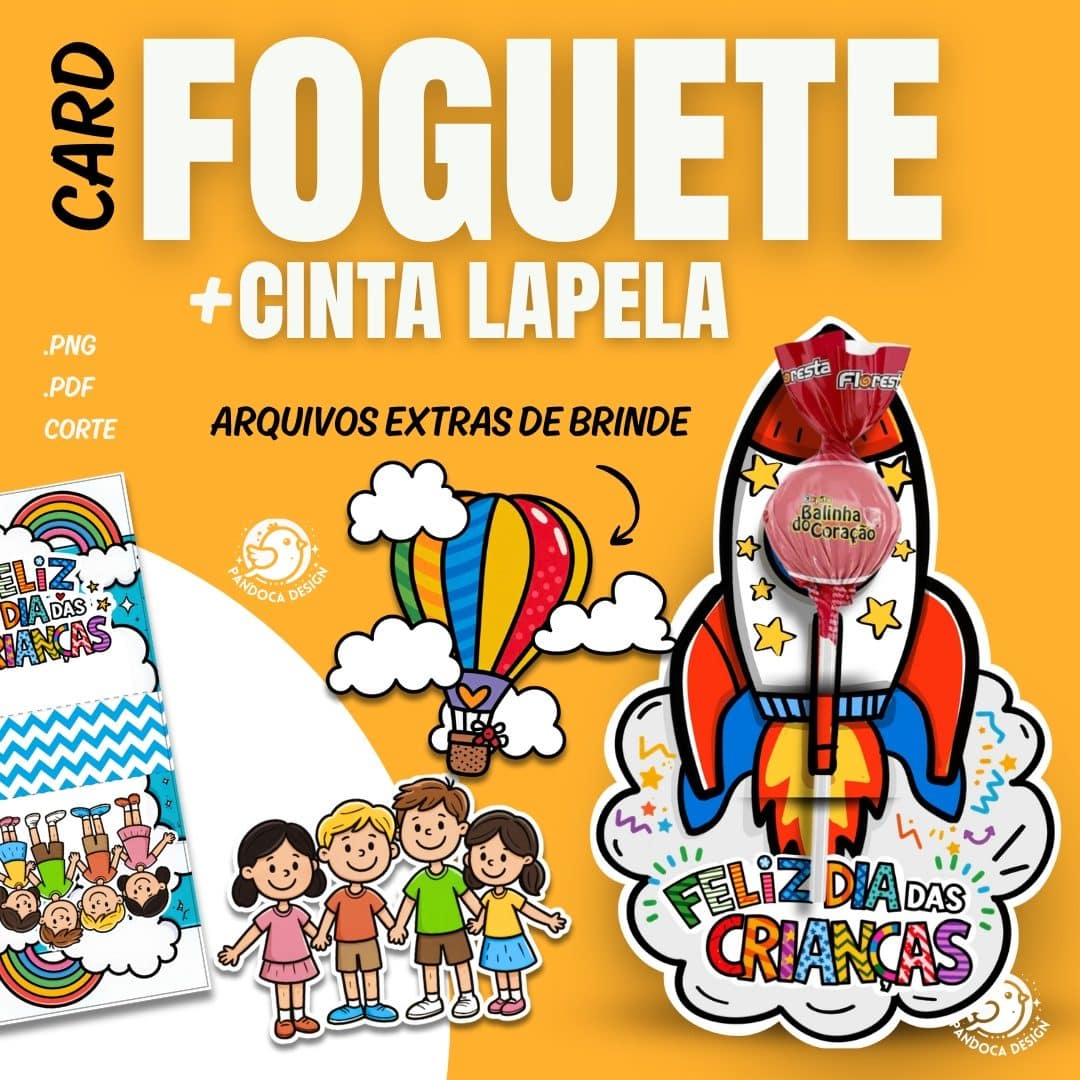 (Arquivo GRATUITO) Card Foguete + Cinta Lapela DIA DAS CRIANÇAS