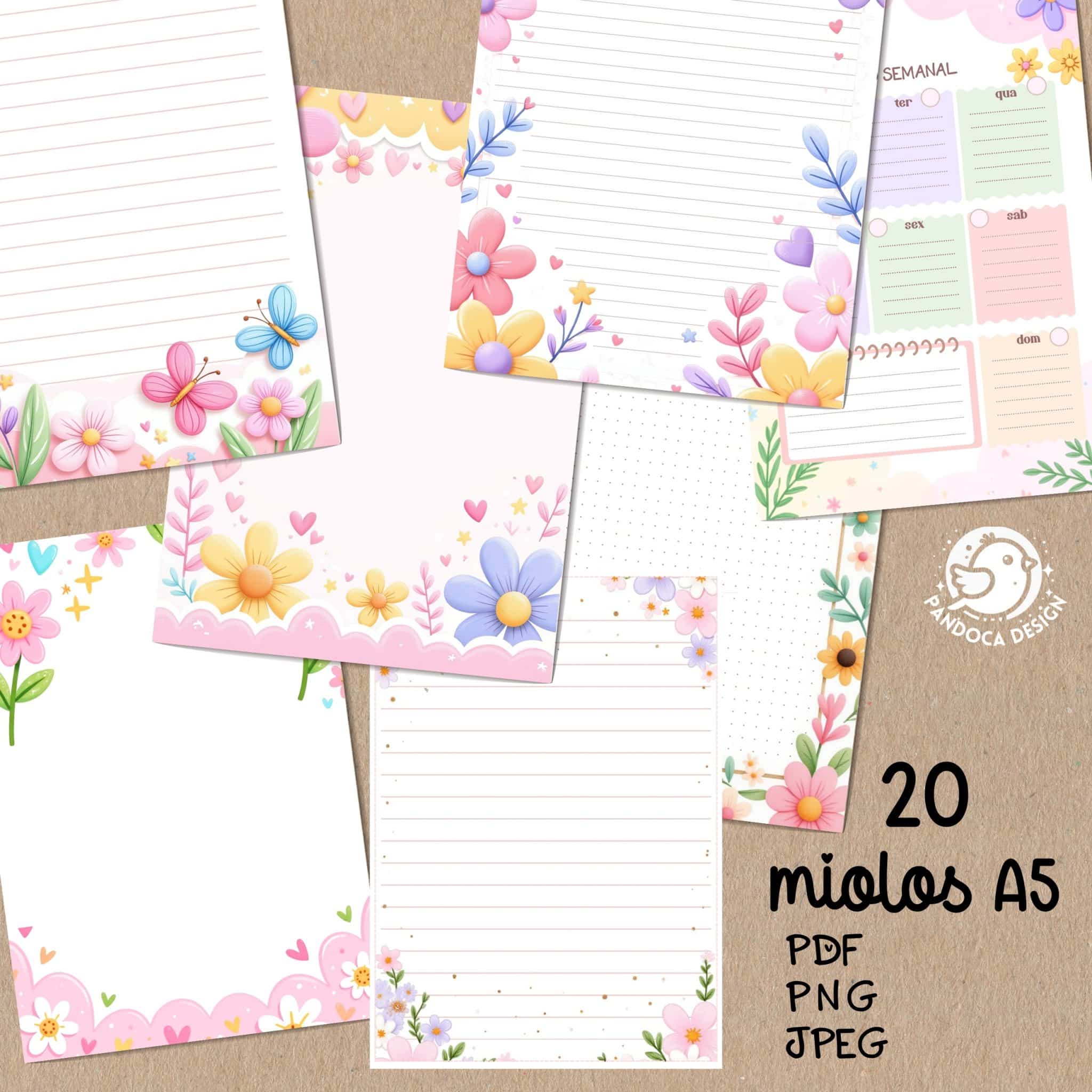 São 20 arquivos exclusivos em tamanho A5, sendo 19 modelos de miolo de caderno e 1 planner semanal.